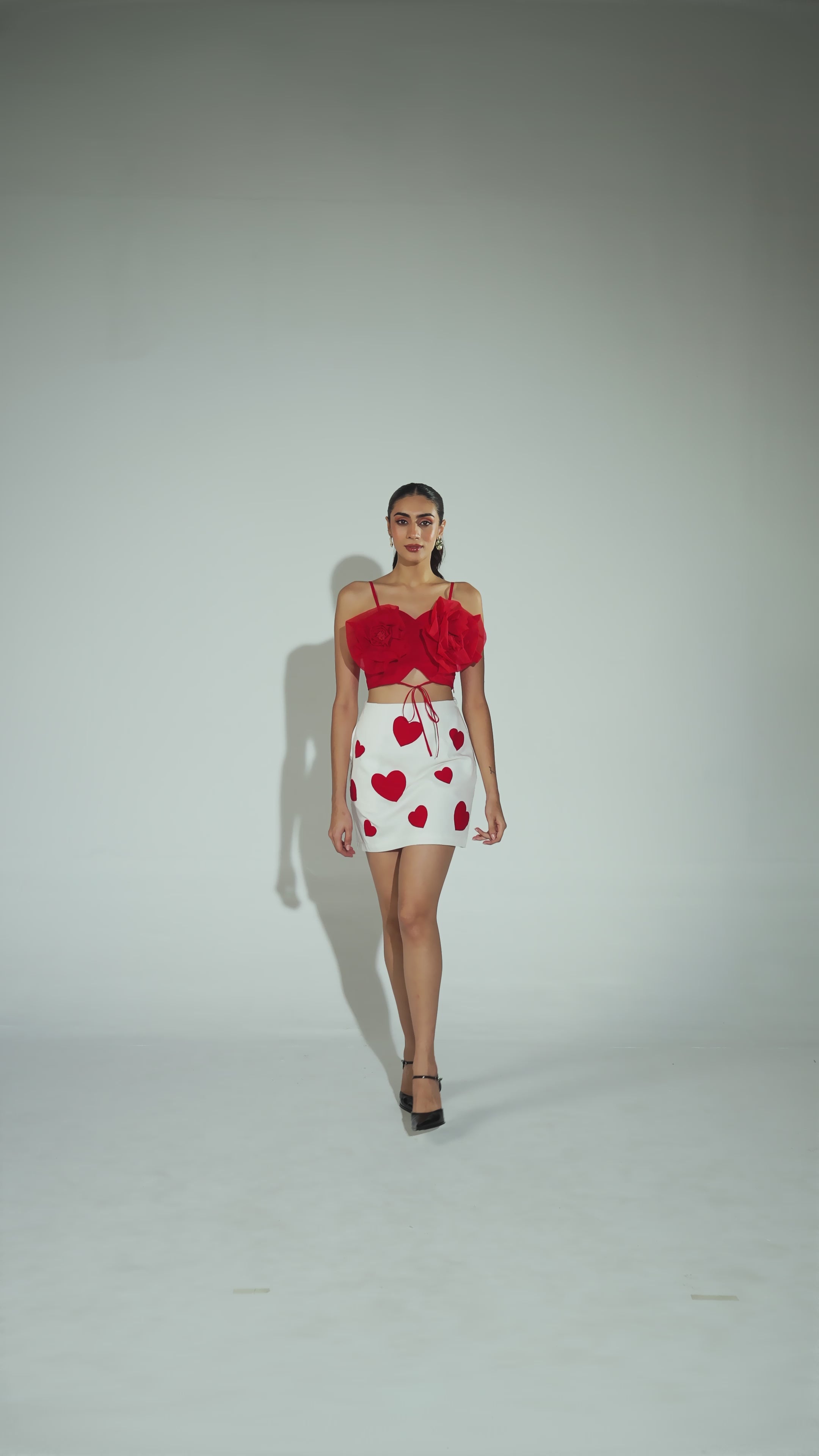 A charming white skirt adorned with bold red heart appliqués. Each heart is delicately stitched to create a playful, romantic look, adding a pop of color to the crisp white fabric. Perfect for date nights or adding a touch of whimsy to your everyday style, this skirt is all about making a statement with a touch of love.