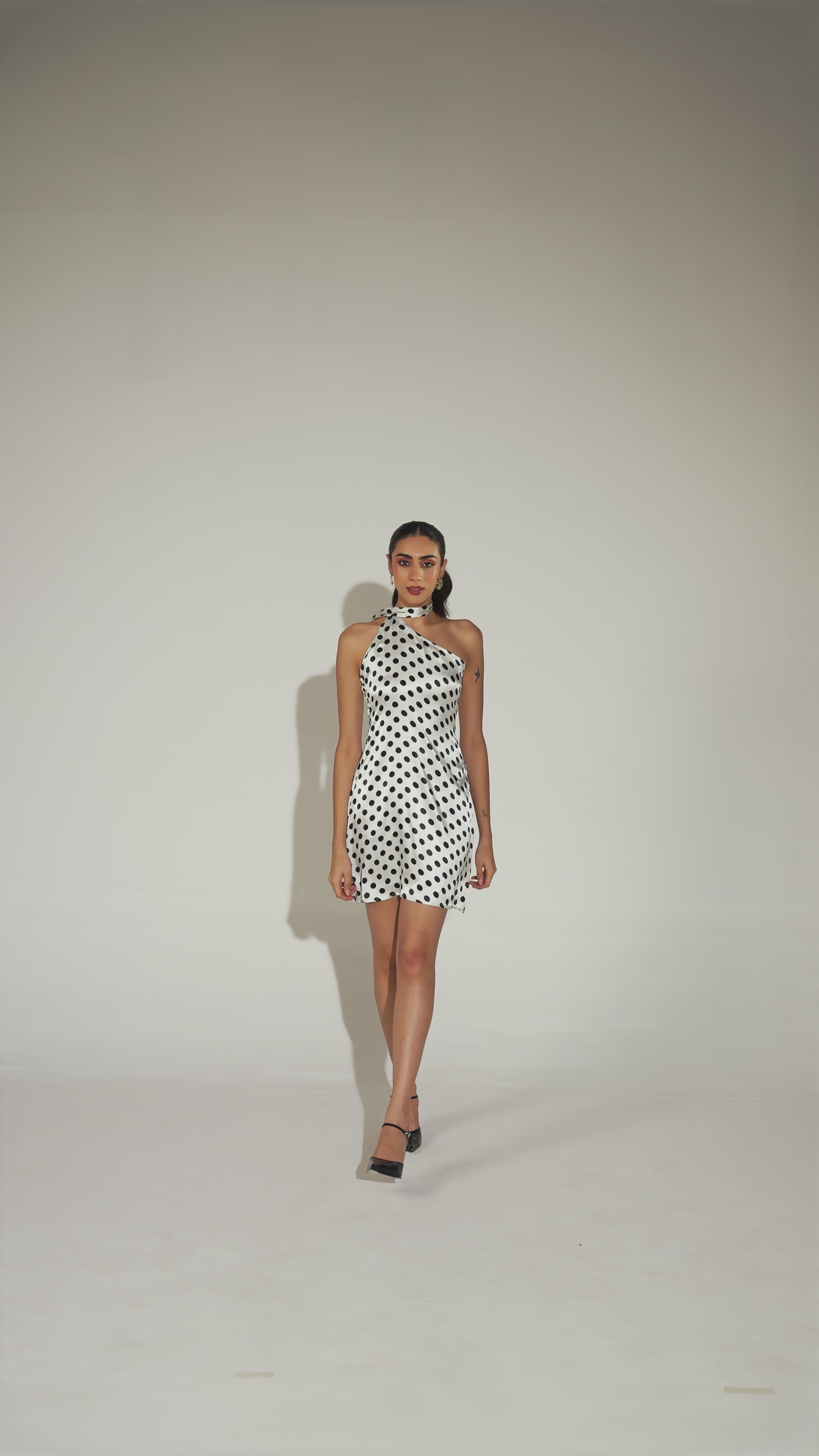 Introducing The Bella Dot . With a chic asymmetrical neckline and neck sash, this mini dress features an A-line skirt that adds volume and flow. Fully lined for comfort and a seamless look, it offers a flattering fit for any occasion.