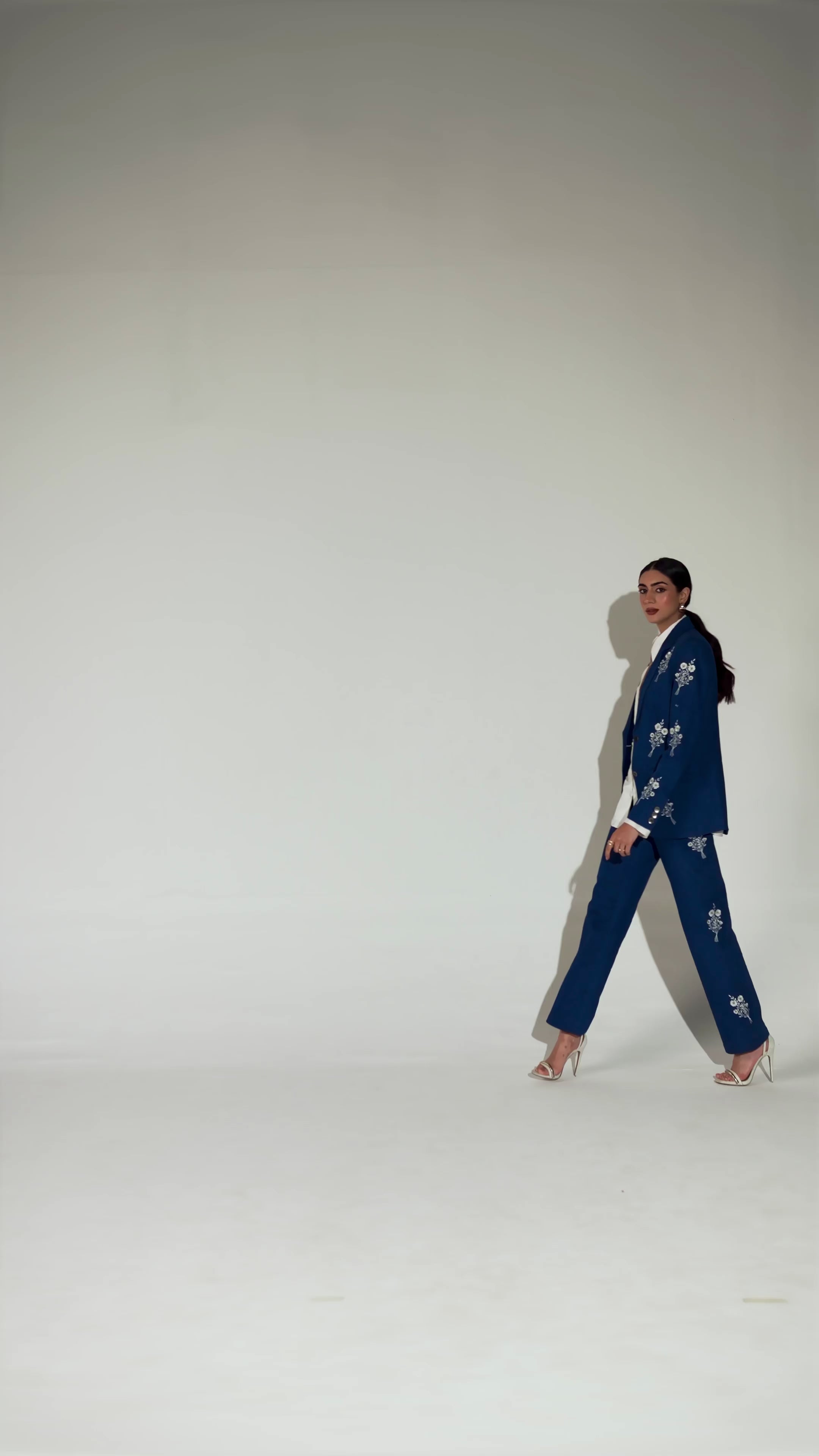 A sophisticated denim blazer and pant duo that captures elegance with a touch of artistry. The blazer boasts a tailored silhouette, adorned with embroidered florals. Paired with high-waisted, embroidered pants that mirror the blazer’s floral motif, this set creates a harmonious and striking look. Thoughtfully crafted for versatility and effortless style.